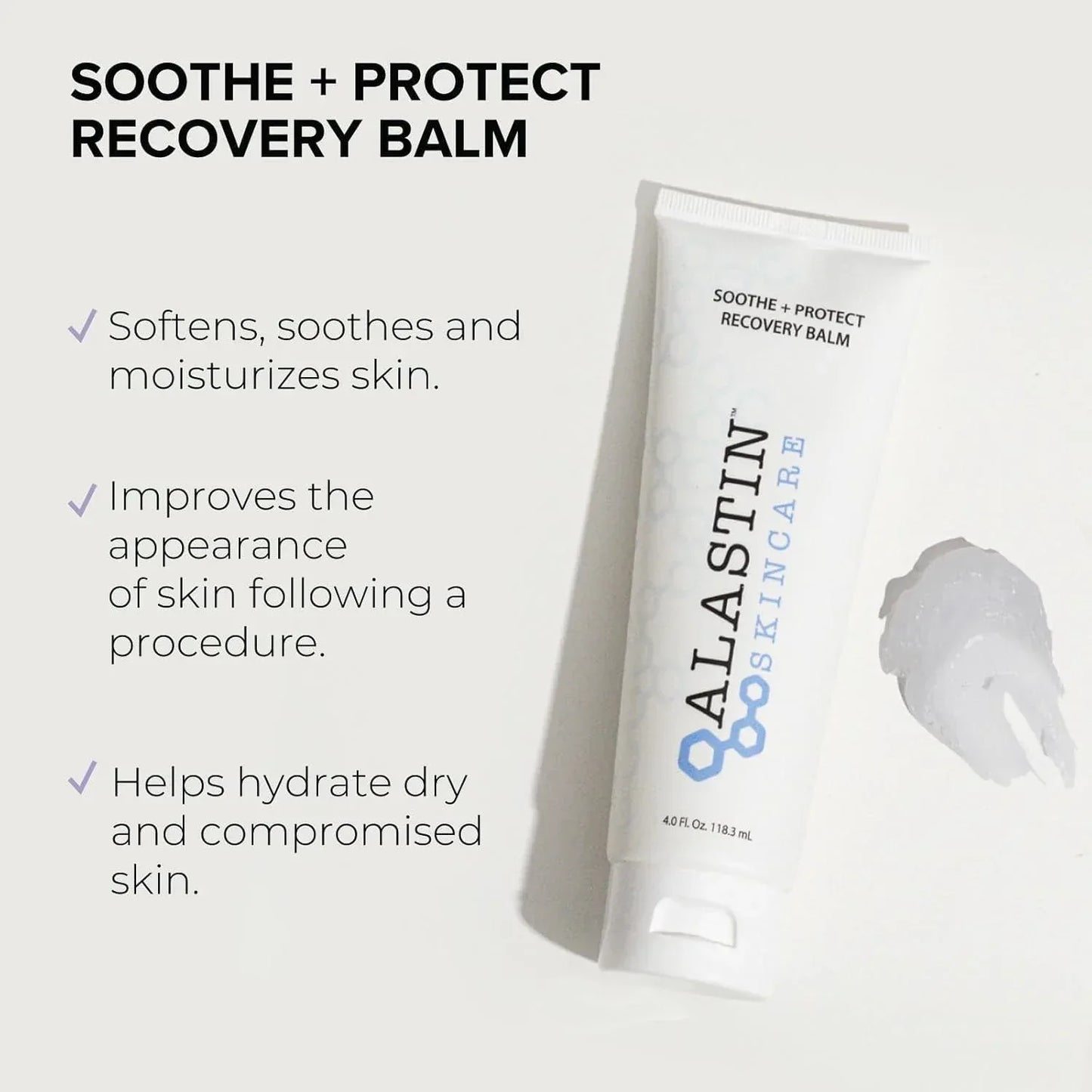 Alastin Soothe + Protect Recovery Balm is a all-in-one treatment that supports skin recovery after cosmetic and skin-rejuvenating procedures. This thick, creamy balm softens, calms, and moisturizes dry, compromised, or sensitive skin. It features Physalis Angulata Extract to help soothe irritated skin and improve its appearance post-treatment, while shea butter triterpenes nourish and soften affected areas. Petrolatum and microcrystalline wax create a protective barrier, helping restore the skin's natural barrier function and lock in hydration. Bisabolol (from chamomile) calms redness, and vitamin E (tocopherol) provides antioxidant benefits, helping the skin feel more resilient and comfortable after procedures. Non-comedogenic and hypoallergenic, it's suitable for all skin types and ideal for use after laser, peel, microneedling, or injectable treatments.