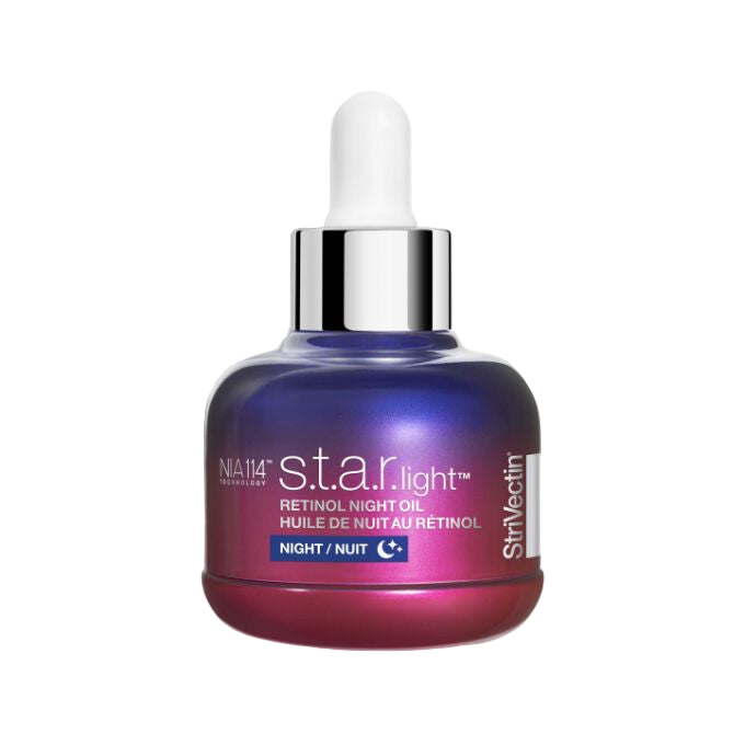 StriVectin S.T.A.R. Light Retinol Night Oil is a next-generation night treatment that transforms skin while you sleep. Formulated with Advanced Retinol, this lightweight yet powerful oil helps correct the look of fine lines, wrinkles, uneven tone, and rough texture, revealing smoother, more radiant skin. The fast-absorbing oil is infused with nourishing plant-derived Squalane and Chia Seed Oil to replenish moisture and strengthen the skin barrier, ensuring hydration and comfort throughout the night. A potent antioxidant duo of Astaxanthin and Pro-anthocyanidins provides protection against oxidative stress, while calming properties help soothe irritation. Clinically proven to deliver visible improvements in just 4 weeks-with zero irritation reported- this non-greasy oil glides on effortlessly and leaves skin supple, luminous, and renewed by morning.